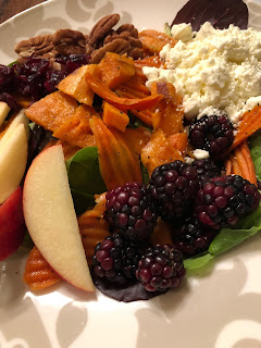 I roasted the sweet potatoes and carrot chips in advance and just kept them in the fridge. If you want to saute your apples, you can do that in advance too. That's really the only cooking needed in this salad so once that's ready to go, dinner can be on the table in 5 minutes.